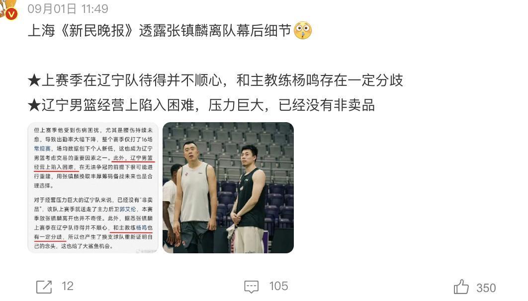 根据新民晚报在最近撰写的专题报道,他们提到了两点非常重要的事情。首先他们表示张镇麟其实上个赛季在球队打得并不是很开心,和主教练杨鸣存在着不小分歧。换句话来说,张镇麟这一次离队实际上主教练是难辞其咎的。